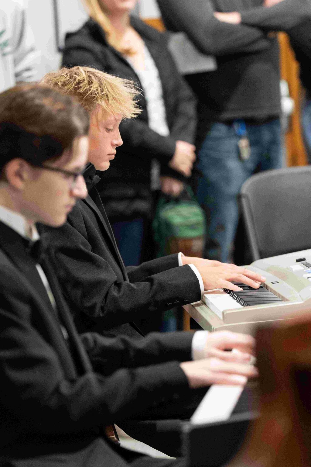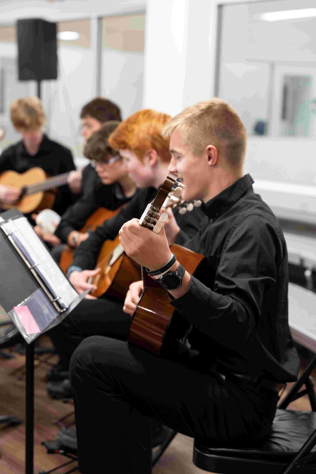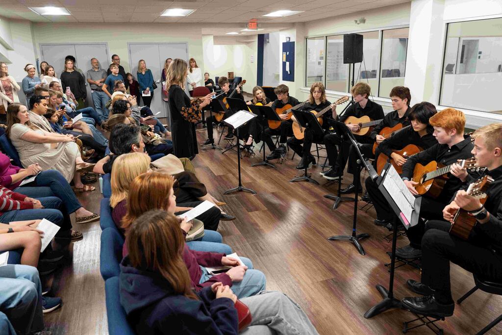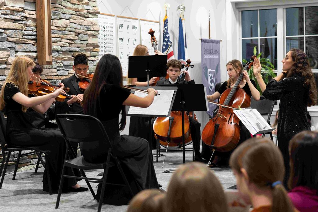 Once again, the Evergreen Christian School Fall Informance was a wonderful showcase of our gifted performing and visual art students. Upon entering the lobby, visitors were greeted with paintings, photographs, and prints from our Art and Photography students. Then, attendees were split into two groups to experience the musical stylings of our Guitar, Jazz Band, Choir, and Strings students, as well as a few selections from our Theater students. Each group got to enjoy a set from different ensembles in the Performing Arts Room and the Student Lounge. This informal, informative performance was a great way to showcase the hard work our students and teachers are putting into the Fine Arts Department. And by the way Math Department teachers, the Fine Arts Departments roll in tuxedos and formal gowns!
