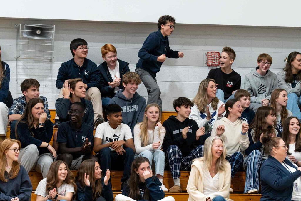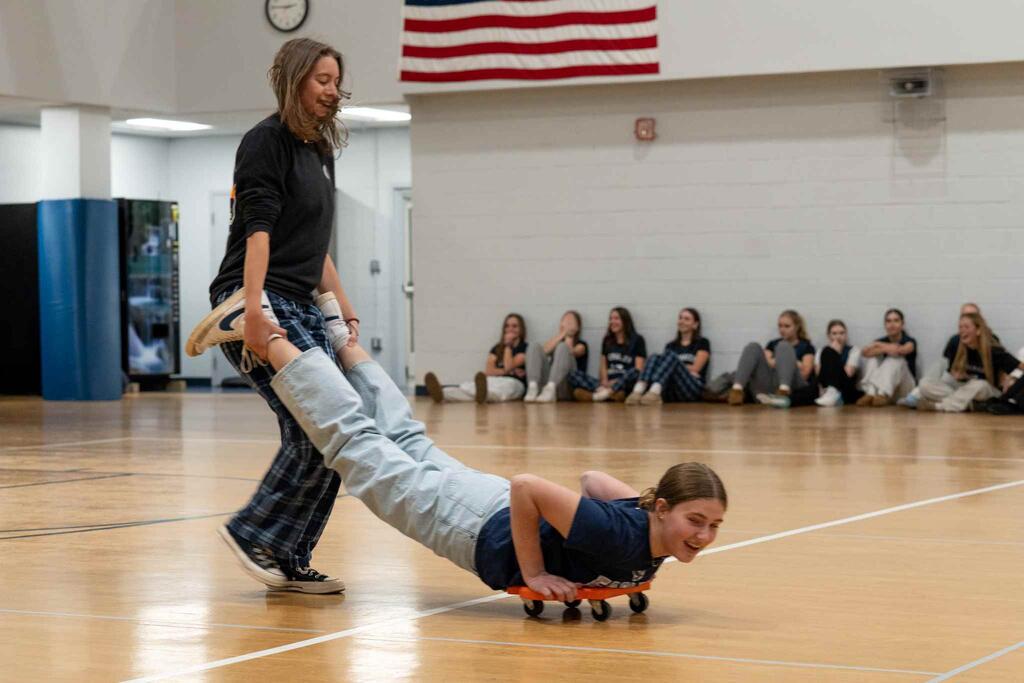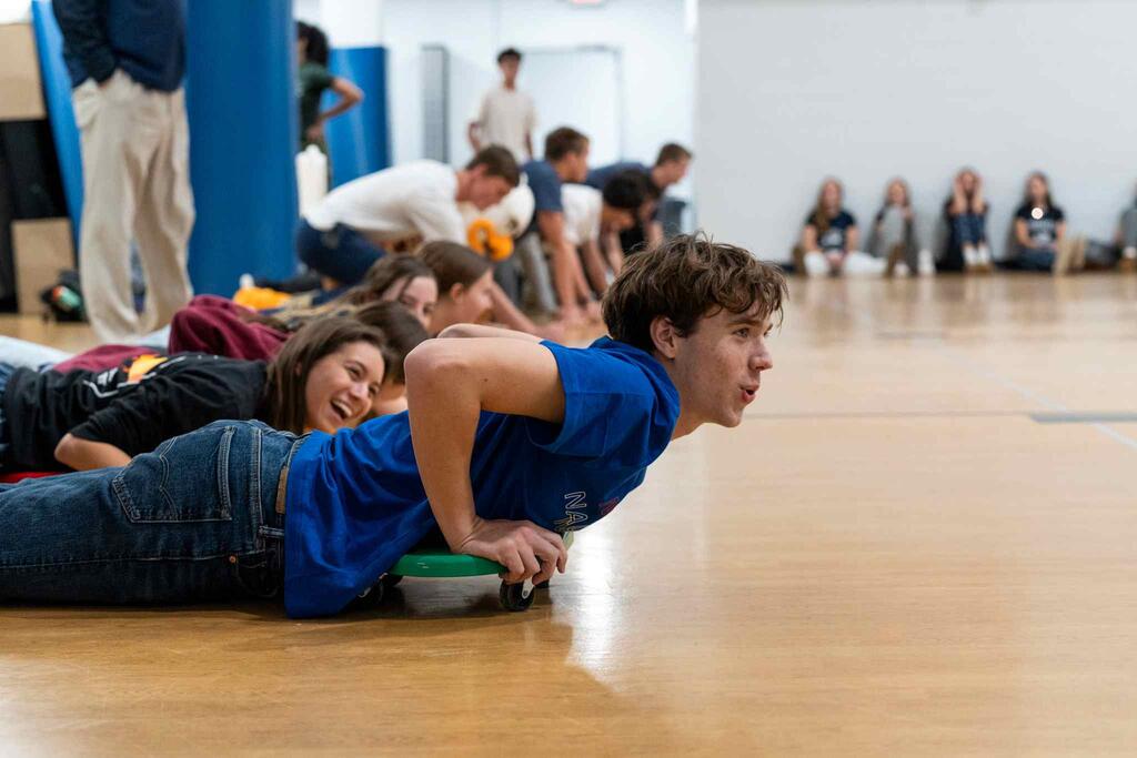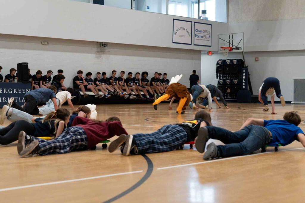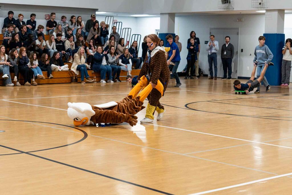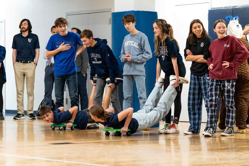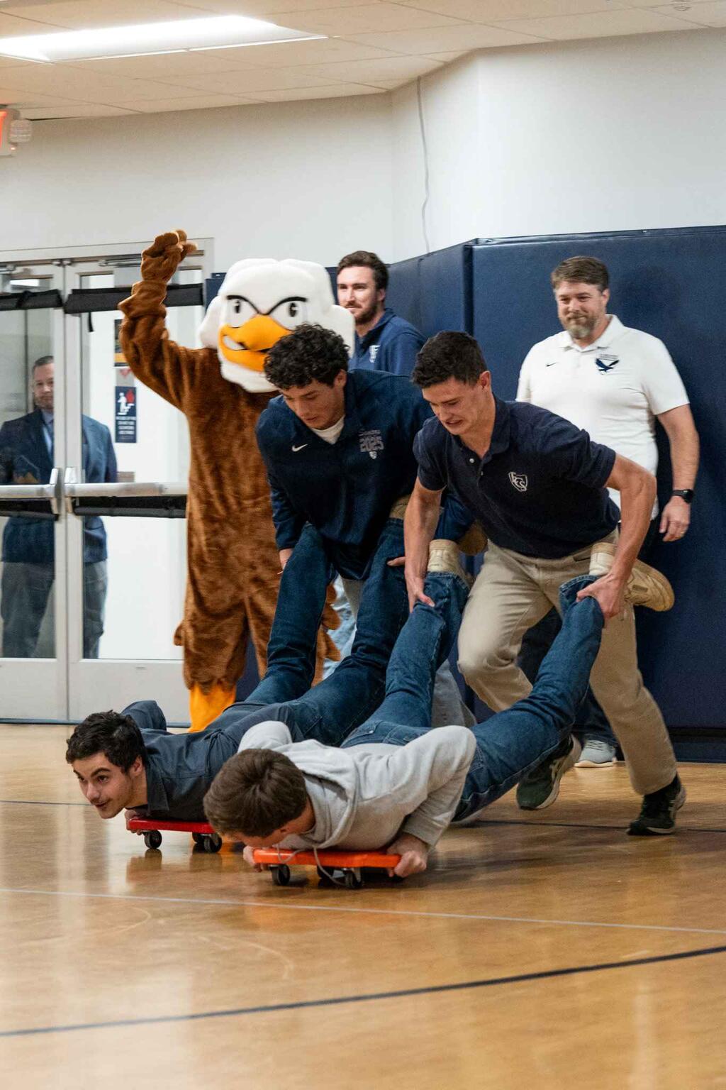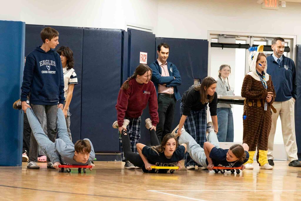Our Winter Sports Pep Rally was a huge success, bringing together students, athletes, and faculty to celebrate the start of the winter sports season. The event was a lively introduction of our talented basketball, swimming, and wrestling teams. Athletes took part in a scooter race across the gym floor, which garnered lots of laughs from the athletes and the crowd alike. Next, our varsity basketball players showcased their shooting skills in a basketball competition on the court. Coach Kris Johnson encouraged students and staff to rally around our winter athletes and support them by coming out to games and meets this upcoming season.