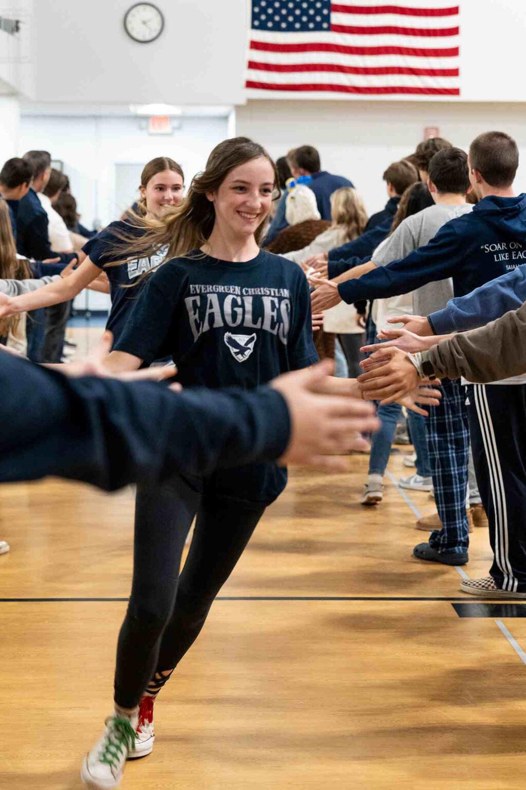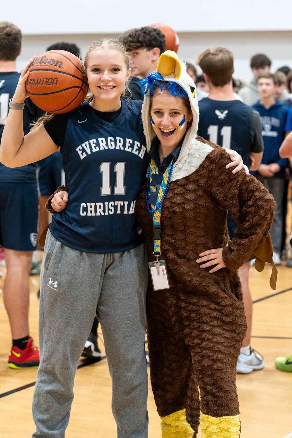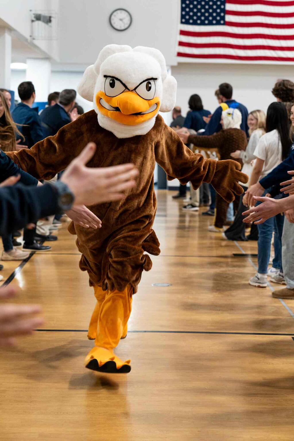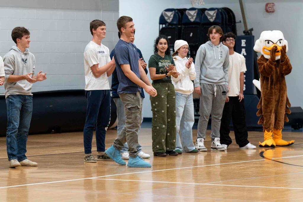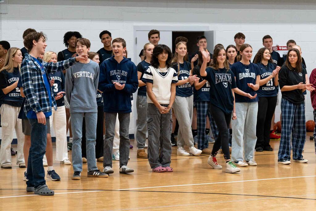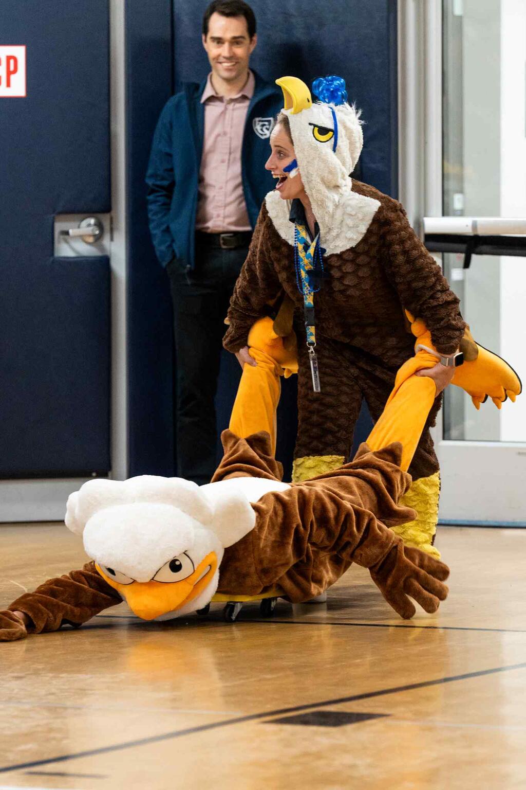 Our Winter Sports Pep Rally was a huge success, bringing together students, athletes, and faculty to celebrate the start of the winter sports season. The event was a lively introduction of our talented basketball, swimming, and wrestling teams. Athletes took part in a scooter race across the gym floor, which garnered lots of laughs from the athletes and the crowd alike. Next, our varsity basketball players showcased their shooting skills in a basketball competition on the court. Coach Kris Johnson encouraged students and staff to rally around our winter athletes and support them by coming out to games and meets this upcoming season.