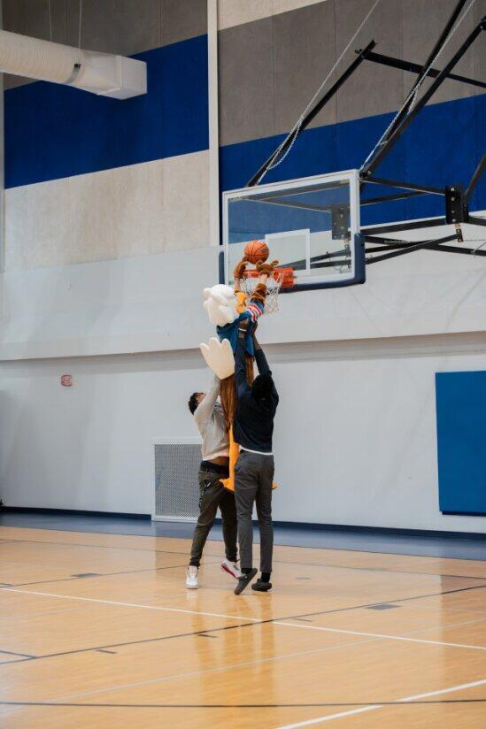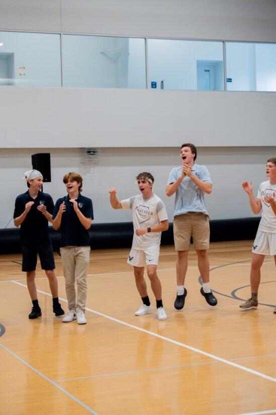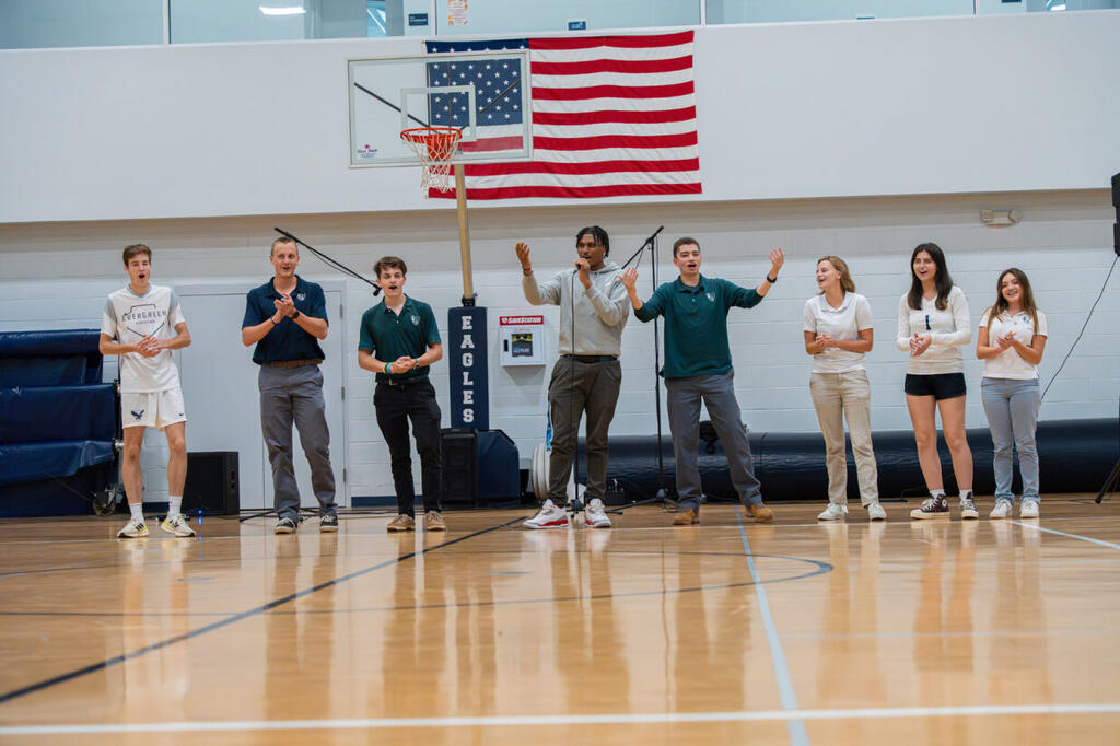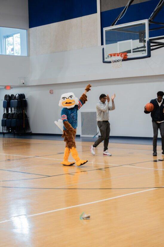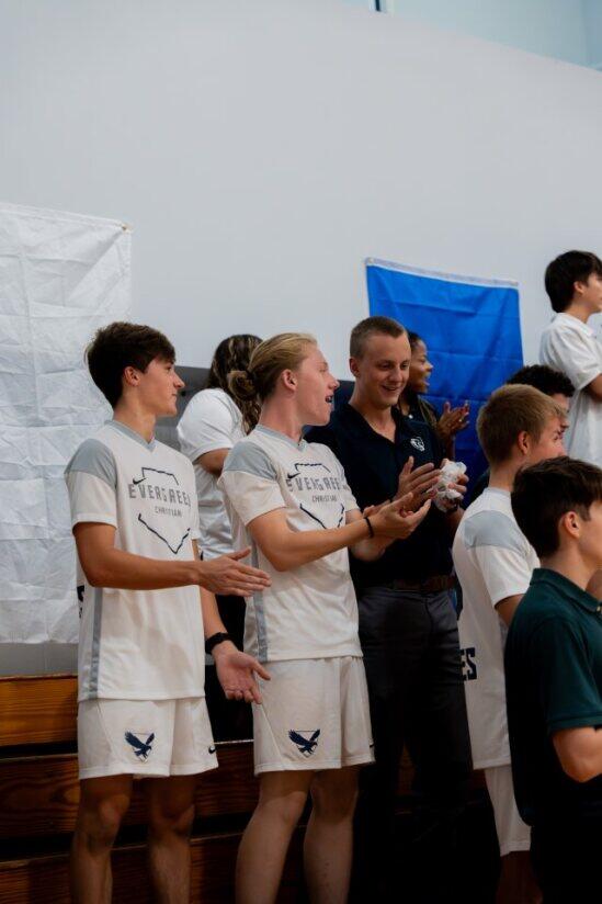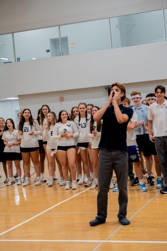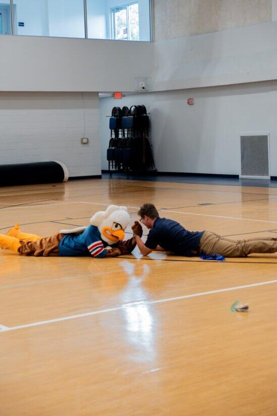 ECS hosted its first pep rally of the school year. In addition to honoring our Fall season teams (Cross Country, Girls Volleyball, and Boys Soccer), we had student tryouts for the honor of suiting up as the school mascot. Several students took their turn dressed as the Eagle and showcasing their best mascot skills. The mascot candidates worked hard to get the crowd riled up, did a lot of dancing, and even tried multiple times to dunk the basketball. Even though this was just our second pep rally as as school, it was by far the loudest and most exciting.