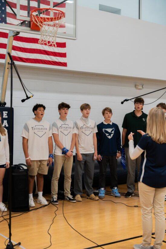 The Honors Choral Ensemble started off the event signing the National Anthem before our Athletic Director, Mr. Kris Johnson, introduced the teams and announced each team roster. The students then participated in a grade level competition to come up with the best school cheer, with the seniors taking home the trophy.
